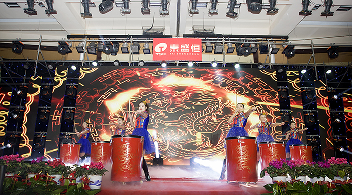 晚會伊始,公司領導與員工們紛紛在簽名墻和許愿樹上簽字并寫下了新年的期待和對公司的良好祝愿。下午4:30,泰盛恒全體職工共同觀看了拜年視頻,現(xiàn)場不時發(fā)出一陣陣掌聲。隨著開場舞《騰飛.泰盛恒》的唯美上演,晚會正式拉開了帷幕。公司董事長馬亞鵬上臺致答謝詞,感謝員工及其家屬一年來的大力支持,并宣布晚會正式開始。